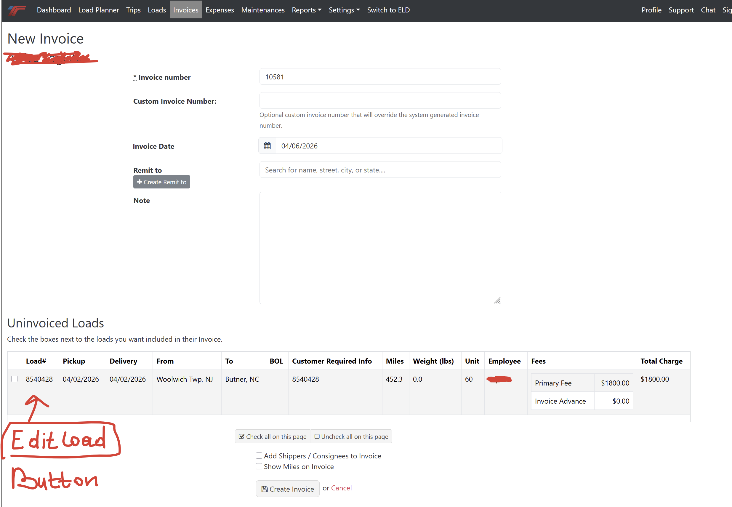 In the New Invoice section, we can see all Uninvoiced Loads before generating the actual PDF invoice.